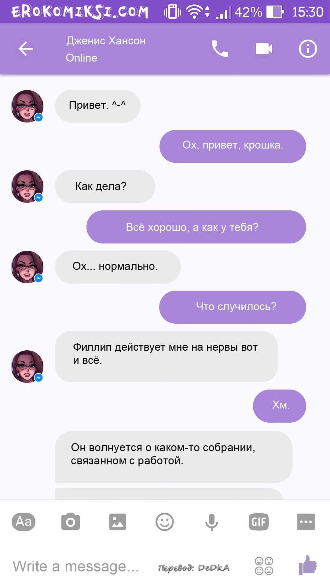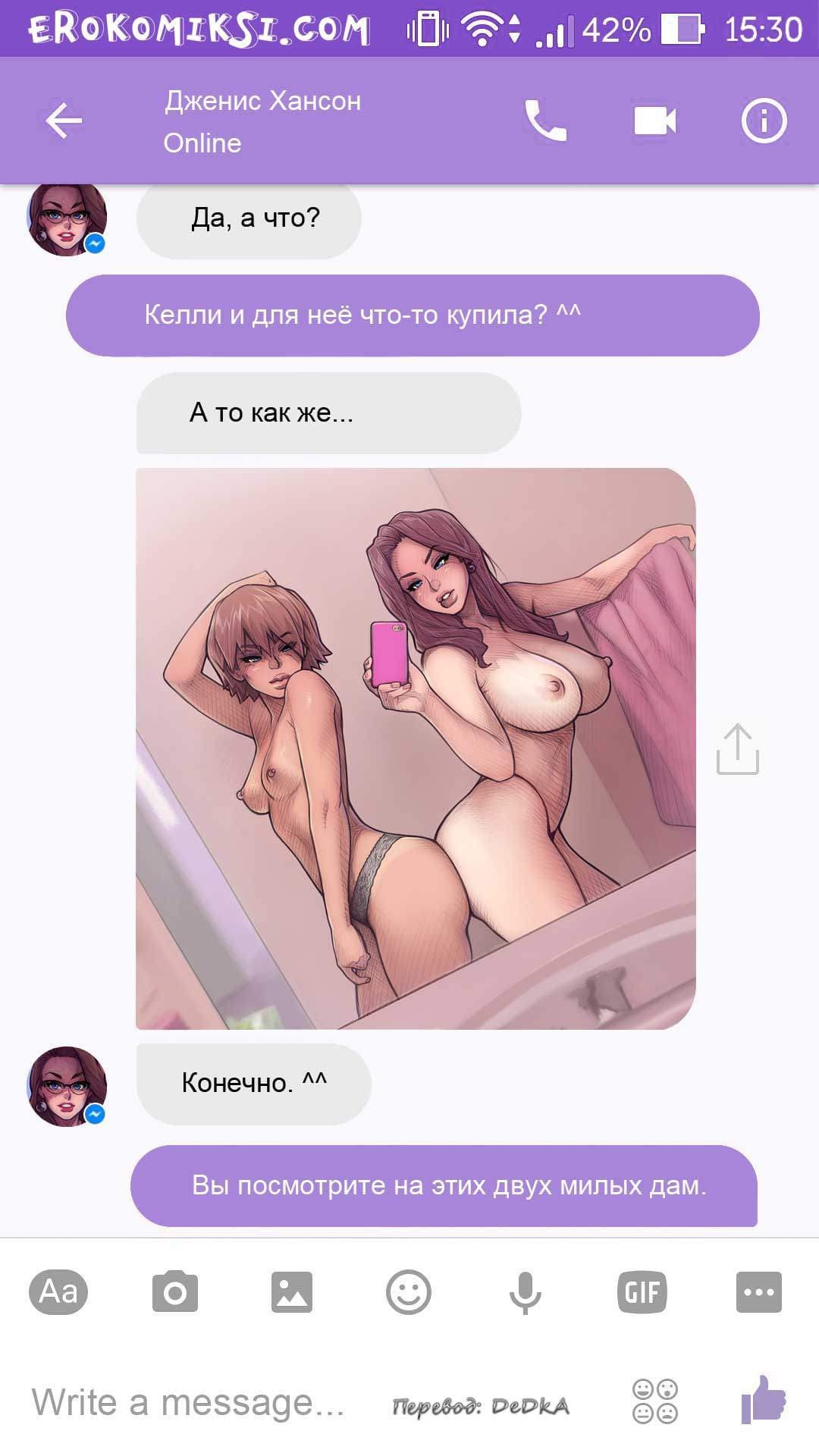 Порно комикс Чат с Дженис расскажет вам о том, что оказывается, девушка по имени Дженис способна устраивать не менее сексуальные чаты, чем сама Хлоя. А может даже и ещё более крутые. Трудно сказать определённо, с кем она ведёт беседу, но из текста переписки понятно, что они совсем недавно трахались. И уж не её ли это похотливый и развратный свекор?