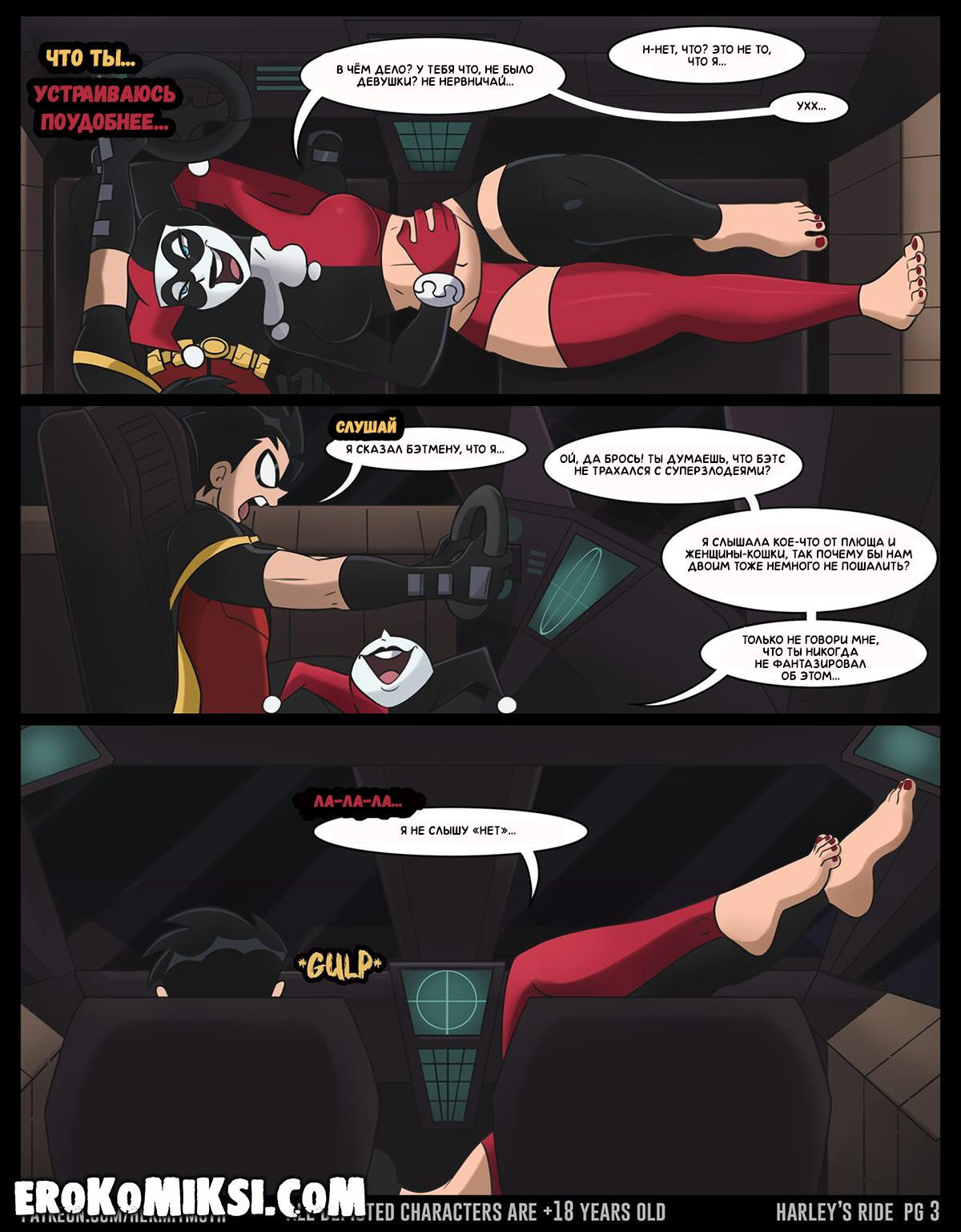 Порно комикс Харли Квинн. Весёлая поездка. У Робина было ответственное задание – поймать и доставить Харли к Бэтмену. Поймав Харли, Робин повёз её к Бэтмену, но в поездке, хитрожопая Харли начала соблазнять Робина и парень не смог устоять перед чарами красотки. Она достала его член и как следует отсосала и Робин наполнил её рот своей горячей спермой, что очень возбудило Харли и парочка перебралась на заднее сиденье, где они трахались несколько часов подряд…