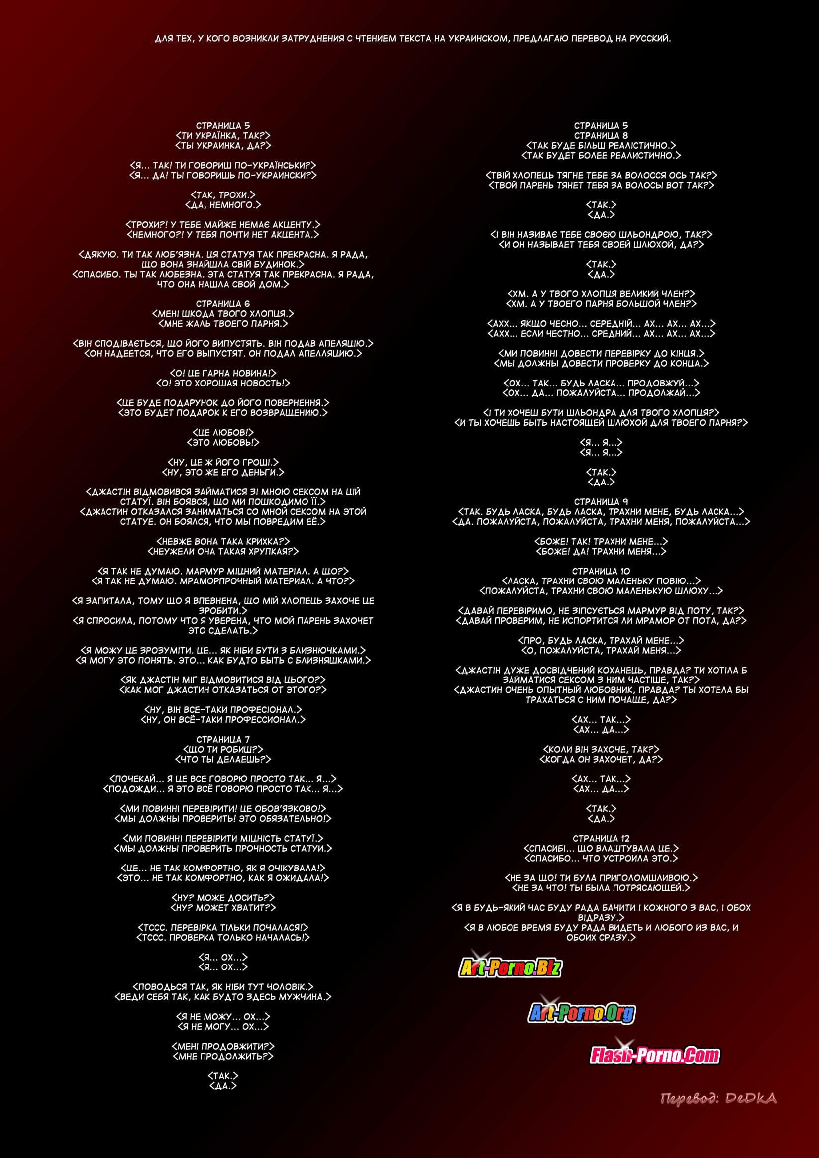 И так, 5 часть секс комикса Канадская подруга начинается с того, что к скульптору, Джастину, неожиданно нагрянула девушка. Как выяснилось, именно ее скульптуру заказал парень этой девушки. Правда, парень угодил за решетку, но он очень надеялся на скорое освобождение. Сегодня же, девушка пришла забрать скульптуру, дабы приготовить подарок своему бойфренду, к его возвращению домой. Но, неожиданно, подруга скульптора предложила гостье, прежде, чем забрать заказ, проверить, не треснет ли она, если на ней… заняться сексом..?