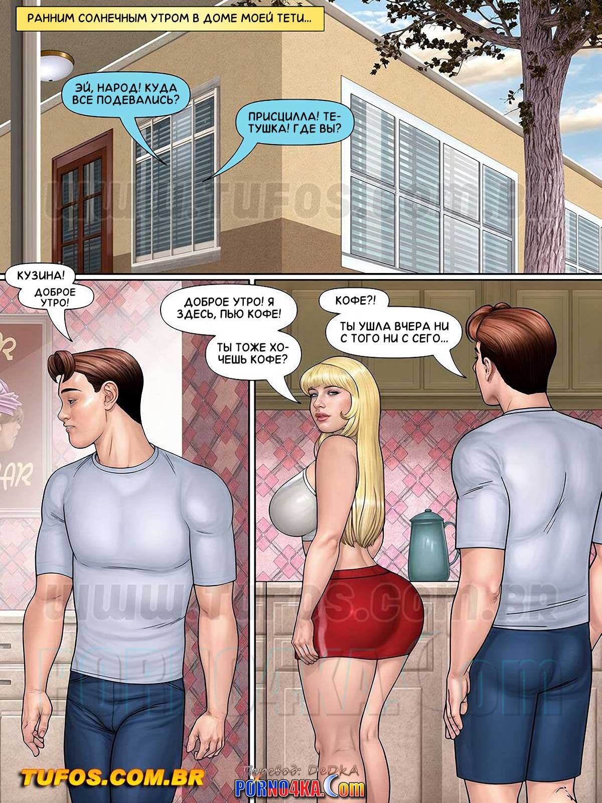 Порно комикс Шаловливая кузина. Часть 3: Задница на кухне. Не подозревая о том, какие отношения сложились у Присциллы и Луиса, Элоиза приглашает Луиса провести ночь в ее доме. Луис по полной воспользовался этим предложением, но оказалось, что ночи не хватило для всего того, что он хотел получить от Присциллы. Но, к его счастью, все сложилось так, что у него появился шанс утром продолжить начатое прямо на кухне…