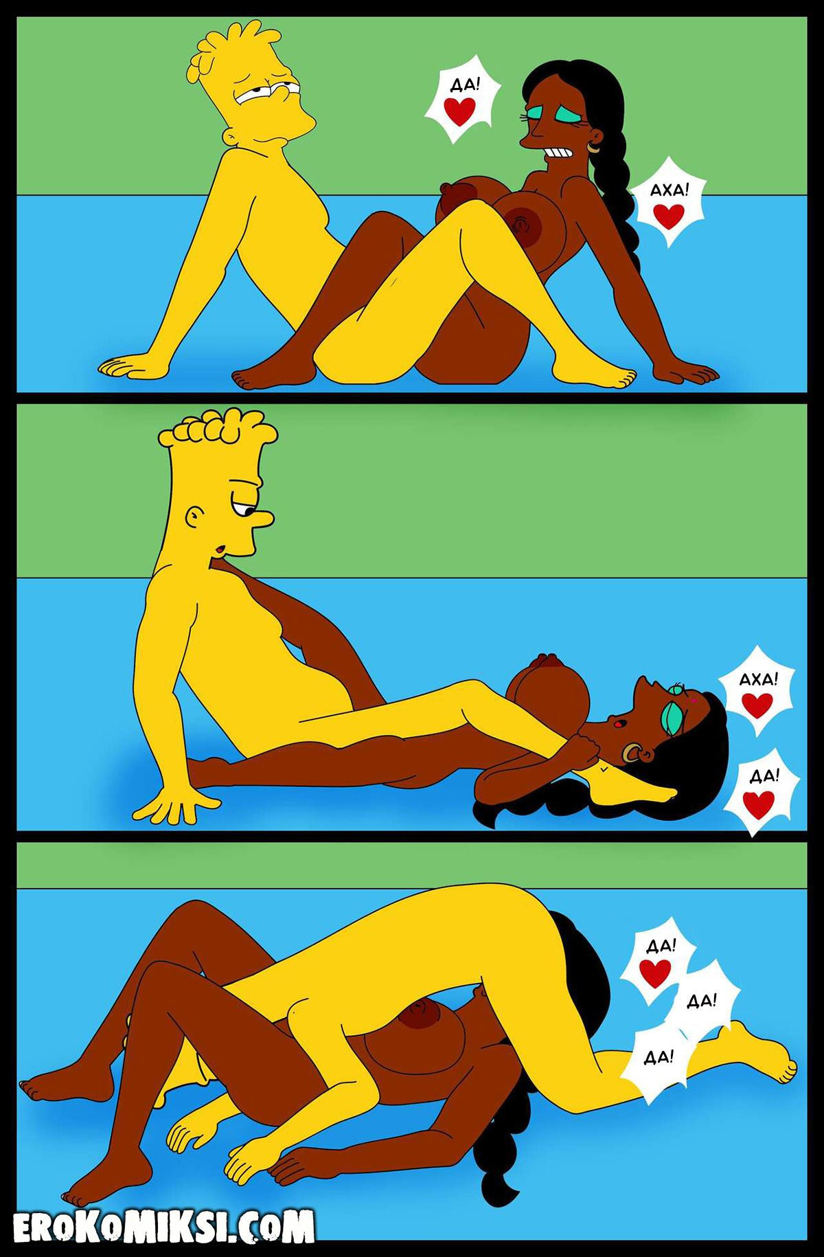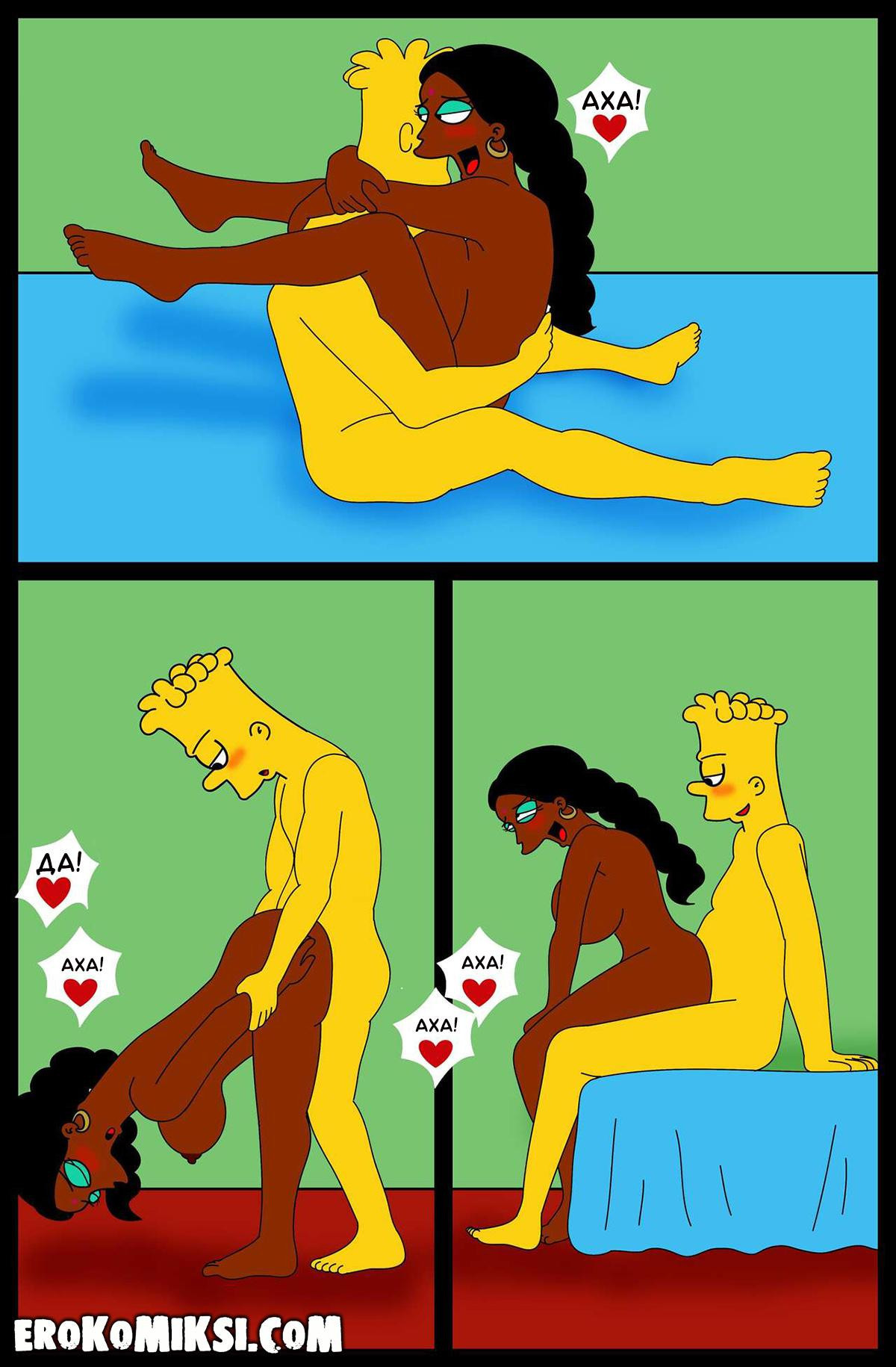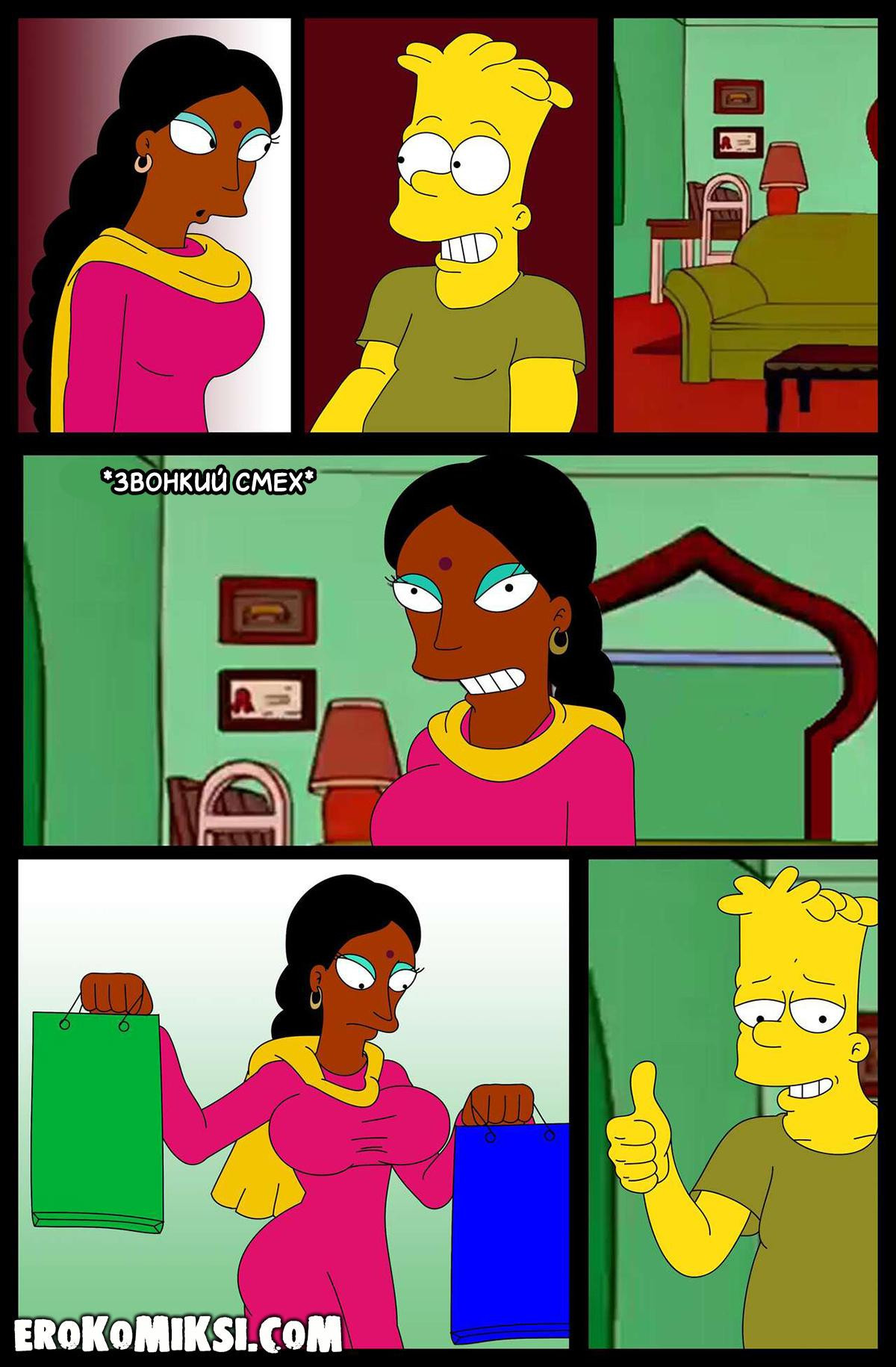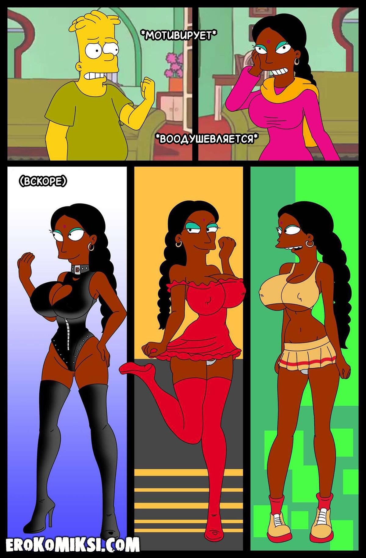 Порно комикс Симпсоны. Услуга Манджуле. Барт отправился в магазин у Апу и увидел, как тот ссорится со своей женой, Манджулой, которая хотела поменять свой стиль в одежде, но Апу был против. Барт решил предложить свою помощь в выборе одежды и Апу доверился пацану. После походов по магазинам, Манджула привела Барта к себе домой и начала примерять обновки. Увидев откровенные наряды сисястой красотке, Барт возбудился и Манджула это заметила, но вместо того, чтобы прогонять извращенца, она позволила Барту хорошенько себя оттрахать…