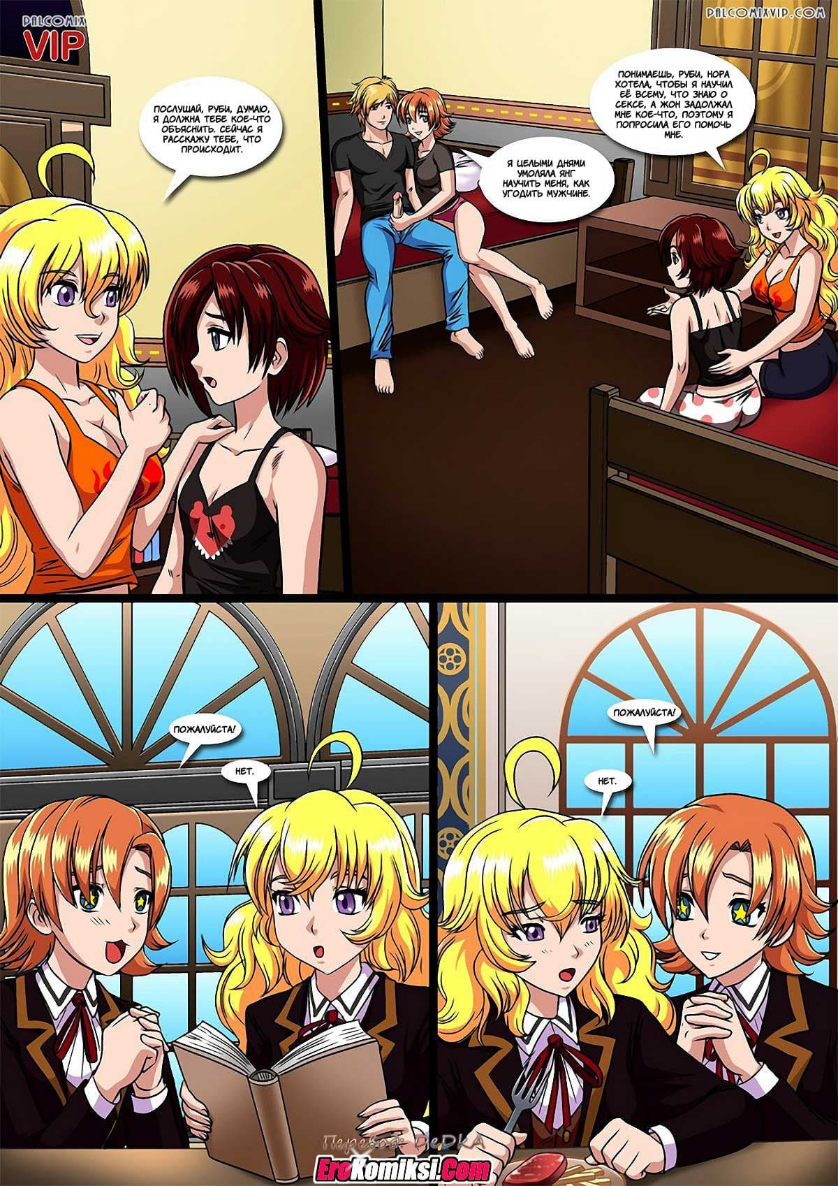 Перед вами сексуальная пародия на сериал RWBY. Каждую ночь в течение последних трех недель Янг украдкой уходила из комнаты после того, как вся команда засыпала. Куда она уходит, задумалась её младшая сестра, и решила выяснить это. Она проследила за старшей сестрой и застала её обучающей свою подругу основам секса. Практическим пособием на этом уроке был не какой-нибудь фаллоимитатор, а настоящий парень…